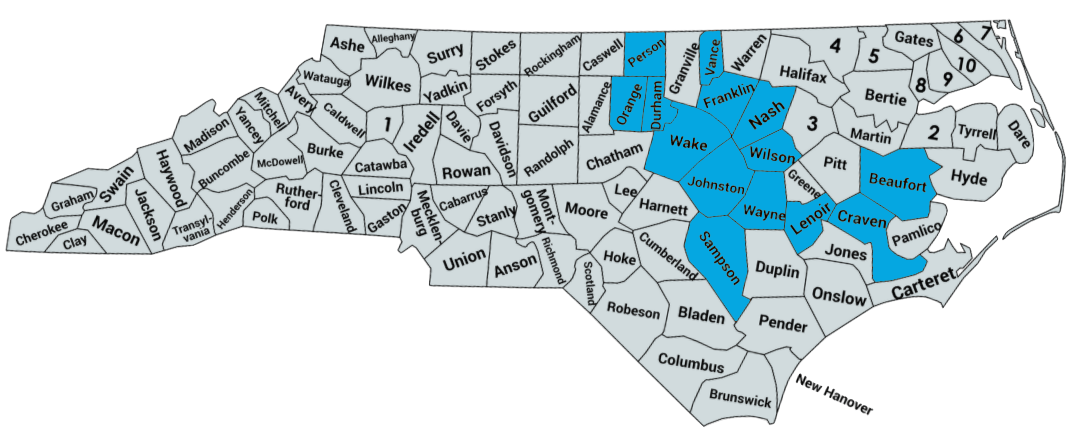 North State Medical Transport is franchised in 14 counties to provide non-emergent BLS ambulance transport for patients within the county lines for the following counties: Beaufort, Caldwell, Craven, Durham, Franklin, Johnston, Lenoir, Nash, Orange, Person, Sampson, Vance, Wake, Wayne, and Wilson. Additionally, we can provide ALS in-county transports in Caldwell, Durham, Franklin, Johnston, Nash, Person, Sampson, and Vance counties.